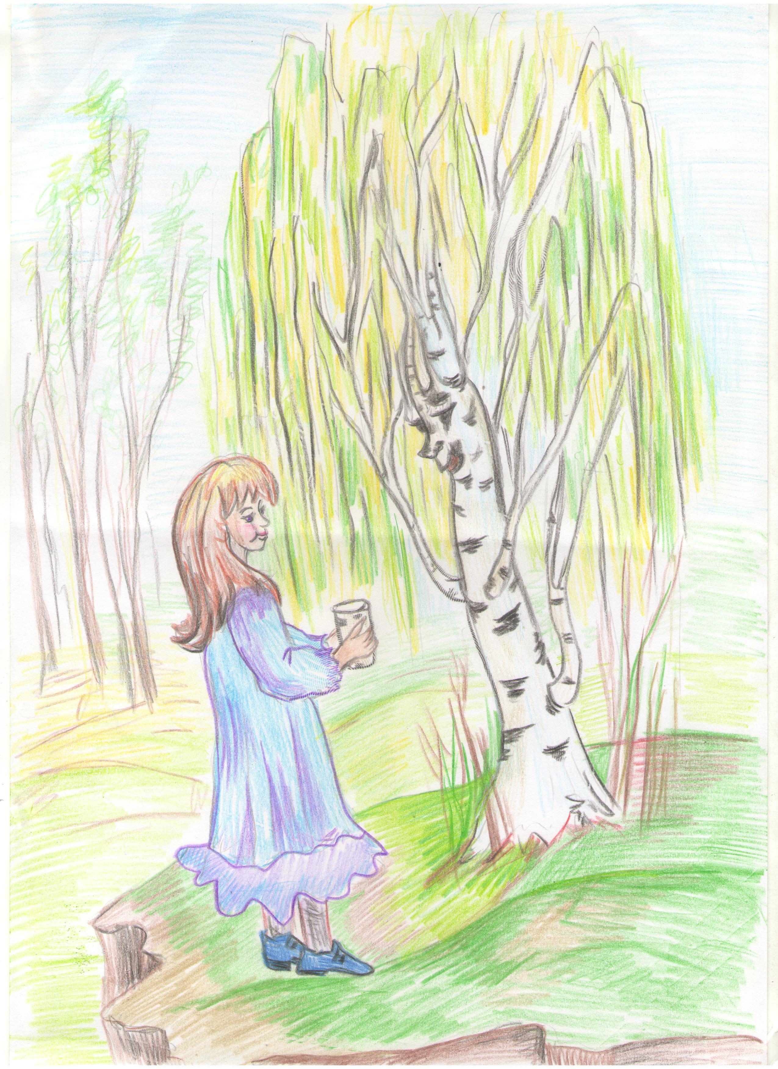 -«Моя древесина очень мягкая, начала она, и не годится для строительства домов. Её используют только мастера декоративно – прикладного искусства, для изготовления различных поделок. Из моих досок изготавливают конные повозки, делают клетки для птиц и животных. Но самые интересные поделки получаются из моей коры. Её называют – береста», - тут березка протянула мне стаканчик из берёзовой коры, в нём было что-то налито.-« Ну и так же, как у клёна из моего ствола добывают сок. Он очень освежающий и полезный. Попробуй, в жаркий день нет ничего лучше. Ну вот собственно и всё что я могла рассказать о себе».
