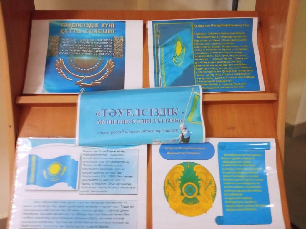 Мектеп кітапханашысы «Тәуелсіздік-мәңгілік елдің тұғыры» атты кітап көрмесін ұйымдастырды./ Школьным библиотекарем была организована выставка ко Дню Независимости.