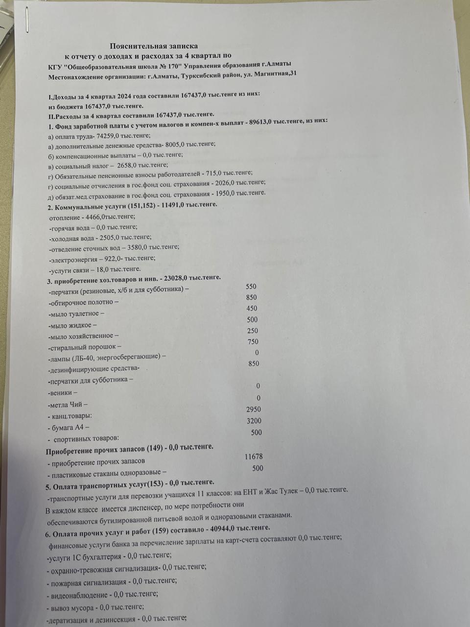 03 ақпан 2025 0 1 2 3 4 5 ТӨРТІНШІ ТОҚСАНДАҒЫ КІРІС ЖӘНЕ ШЫҒЫС ТУРАЛЫ ЕСЕП 2024 жыл/ ОТЧЕТ О ДОХОДАХ И РАСХОДАХ ЗА 4 КВАРТАЛ 2024 года Осы беттің QR-коды:QR-код этой страницы: