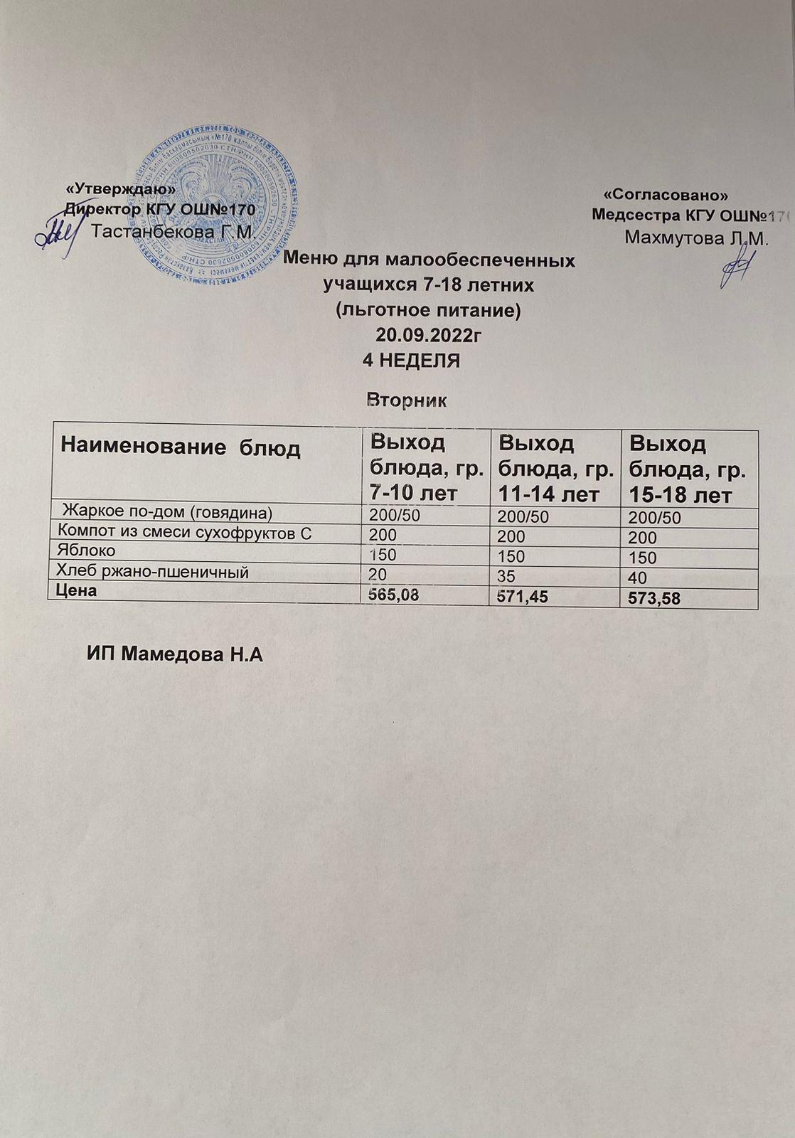Жаз-күз ас мәзірі/Меню питания лето-осень 2021-2022 год