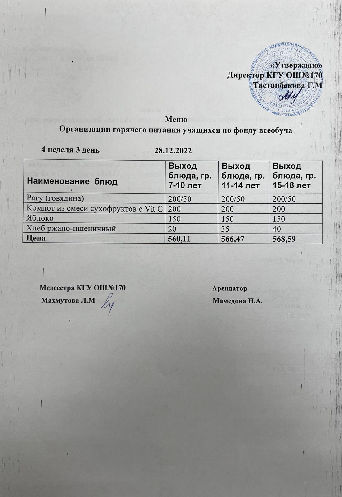 Ас мәзірі/Меню на 28.12.2022