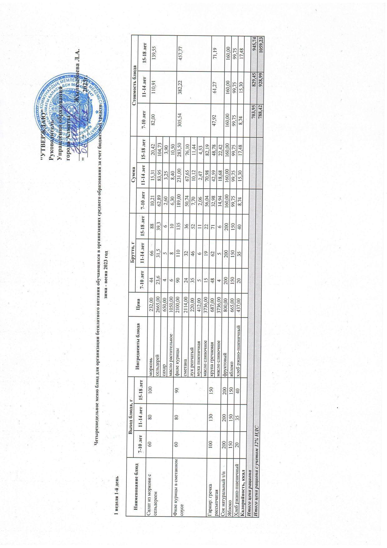 №170 жалпы білім беретін мектеп » Тамақтандыру » Ас мәзірі » Бюджет қаражаты есебінен төрт апталық тағам мәзірі/Четырехнедельное меню блюд для организации бесплатного питания обучающихся в организациях среднего образования за счет бюджетных средств зима - весна