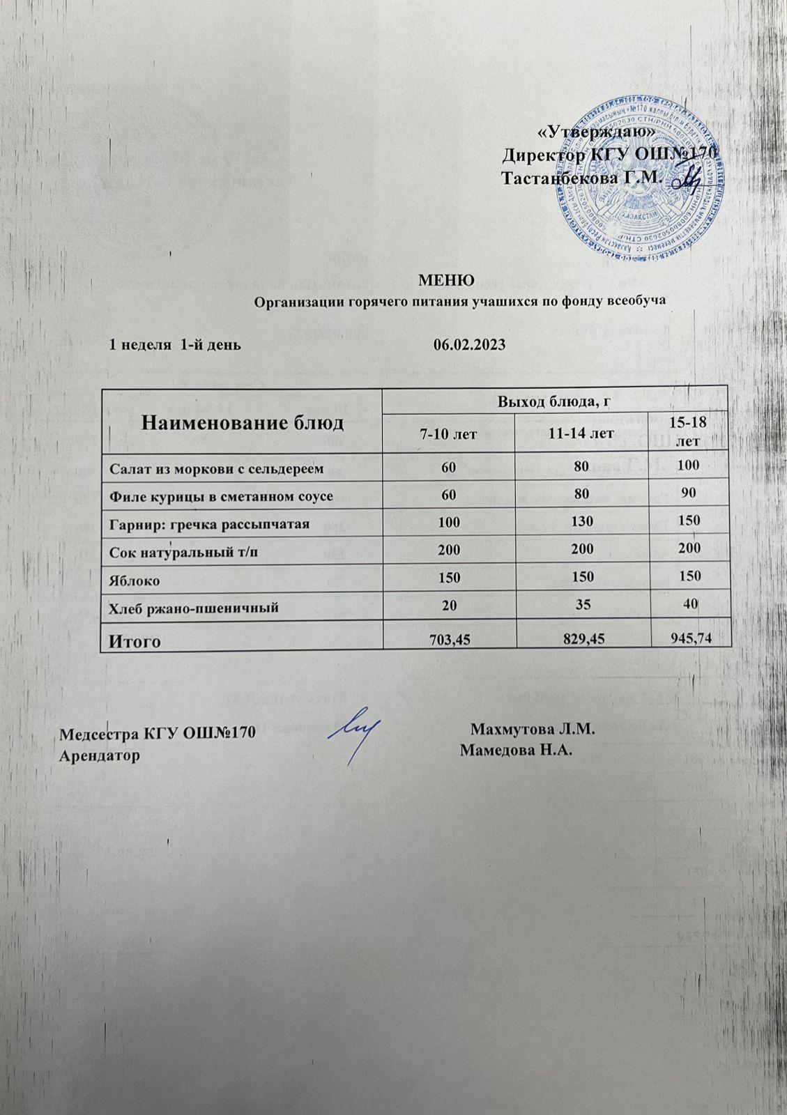 Ас мәзірі/ меню на 06.02.2023