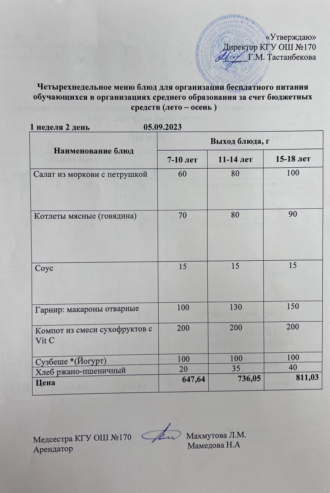 Жазға лагерь ас мәзірі/меню пришкольного лагеря на 13.06.2023