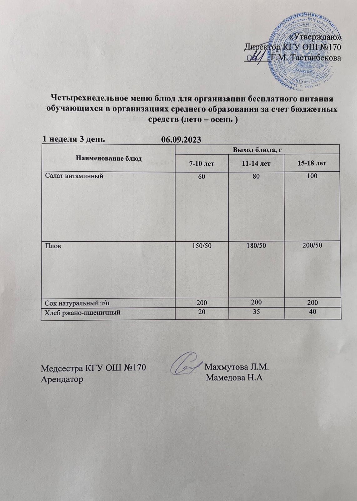 Ас мәзірі / меню на 06.09.2023