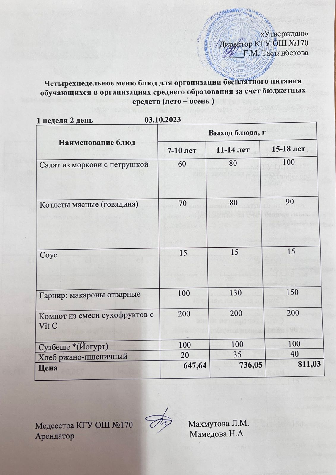 Жазға лагерь ас мәзірі/меню пришкольного лагеря на 08.06.2023