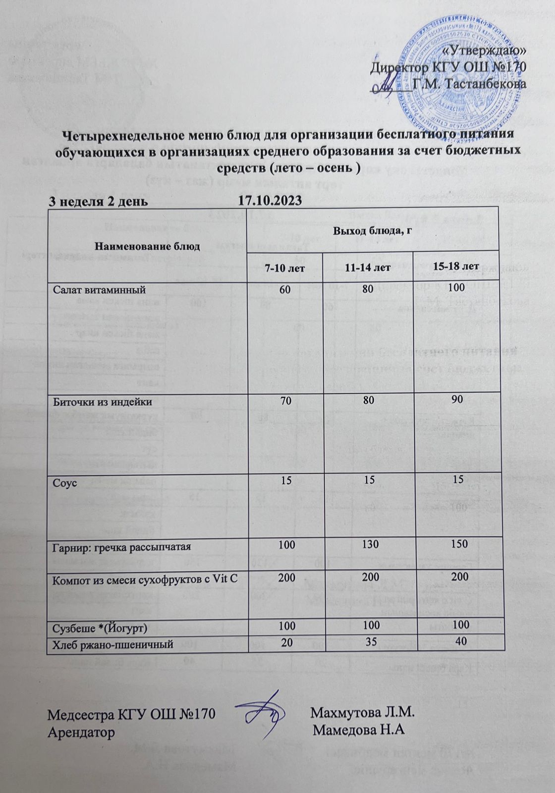 Ас мәзірі/ меню на 17.10.2023