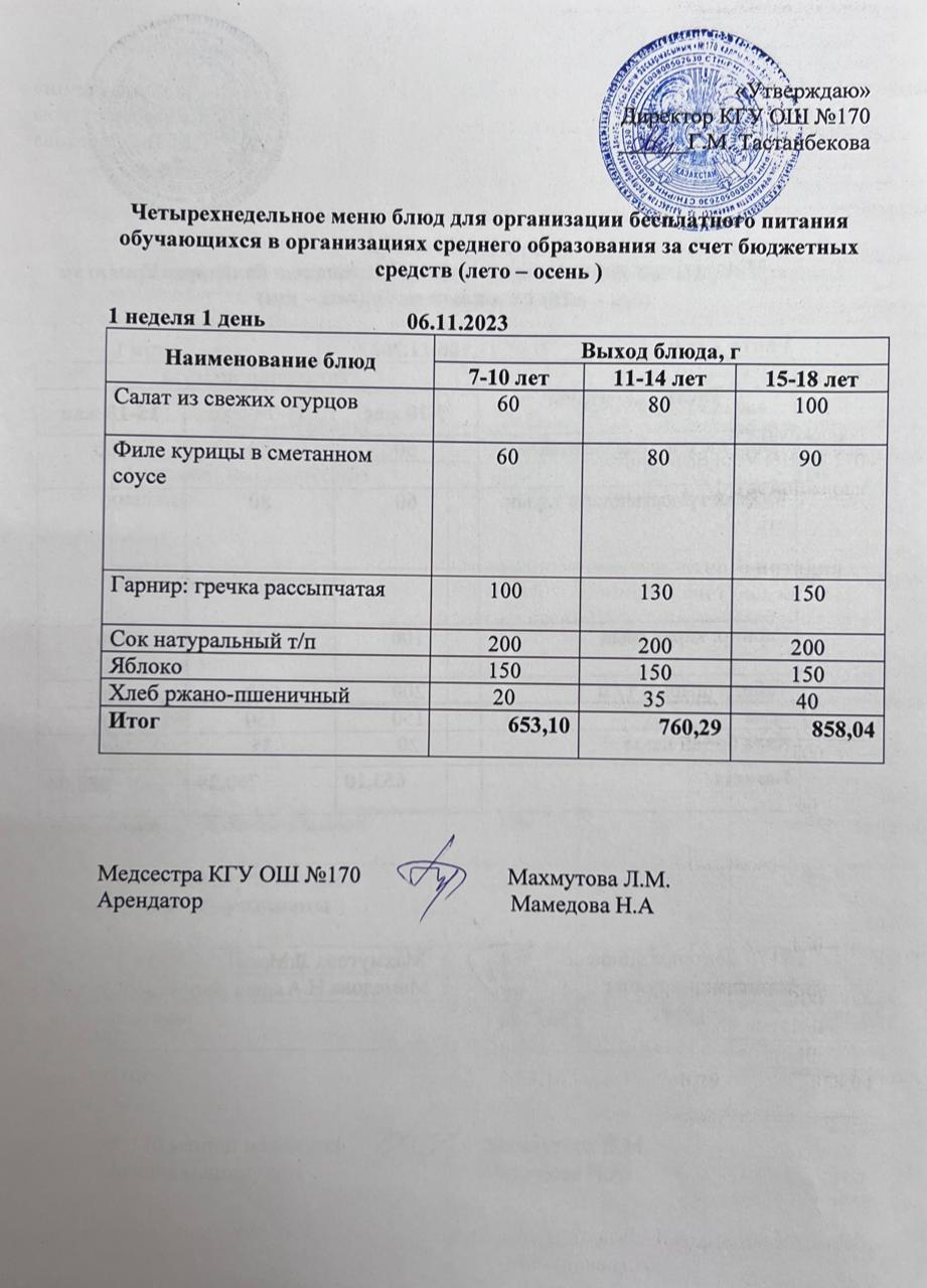 Ас мәзірі / меню на 06.11.2023