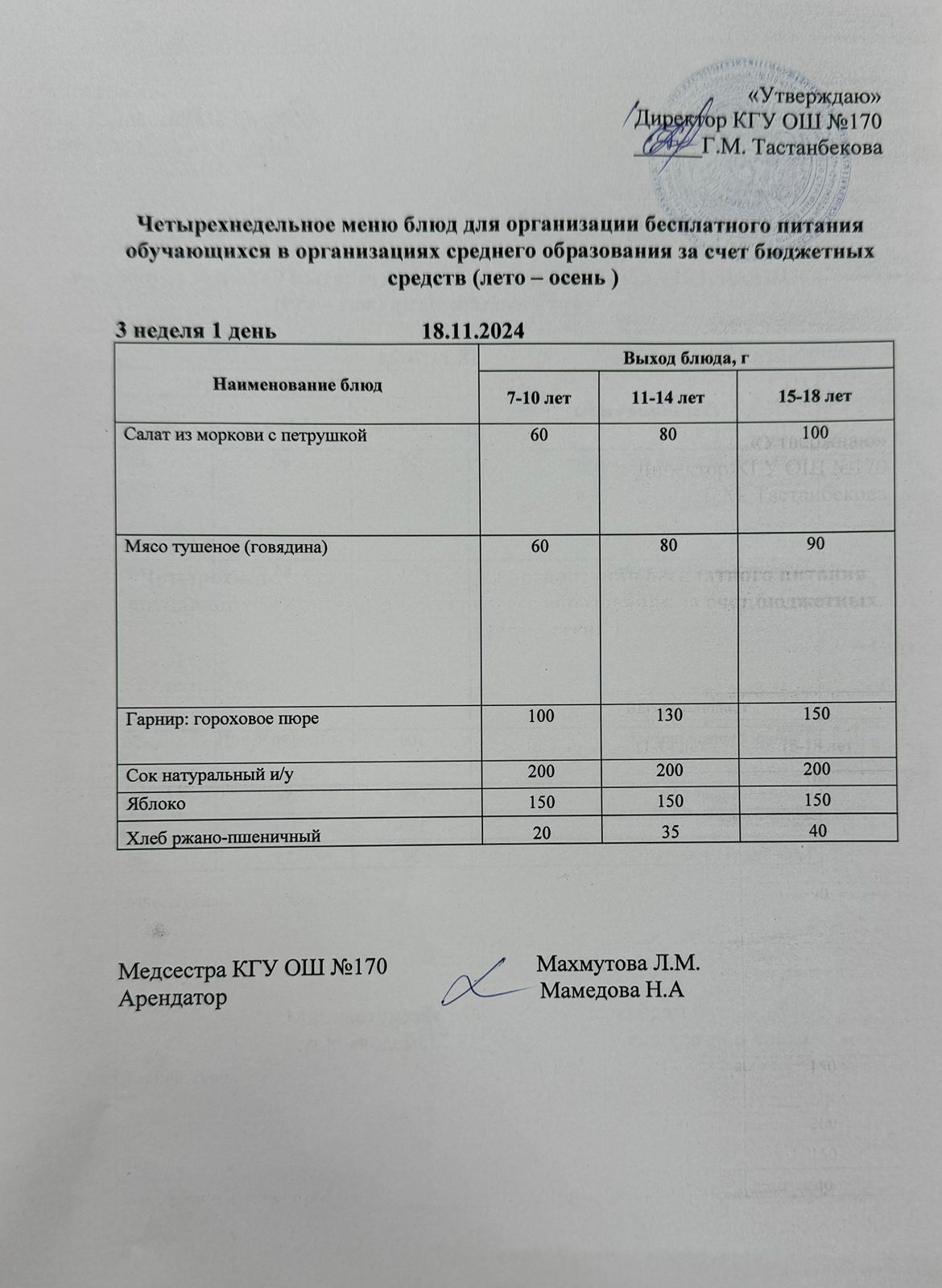 Ас мәзірі / меню на 18.11.2024