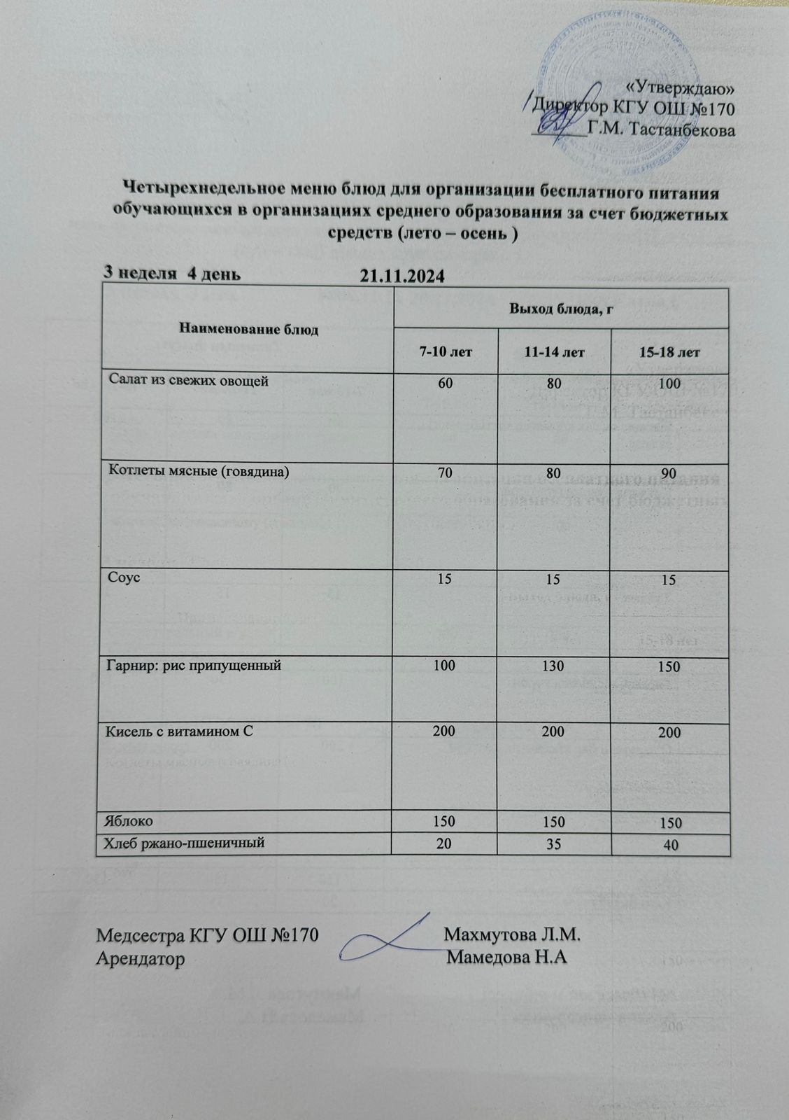 Жазға лагерь ас мәзірі/меню пришкольного лагеря на 29.05.2024ж.