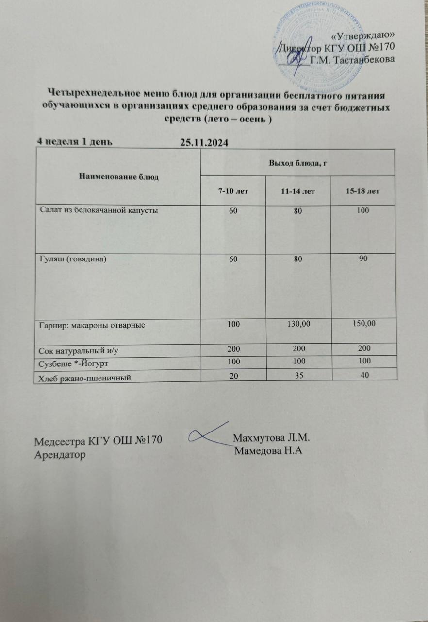 Жазға лагерь ас мәзірі/меню пришкольного лагеря на 04.06.2024ж.