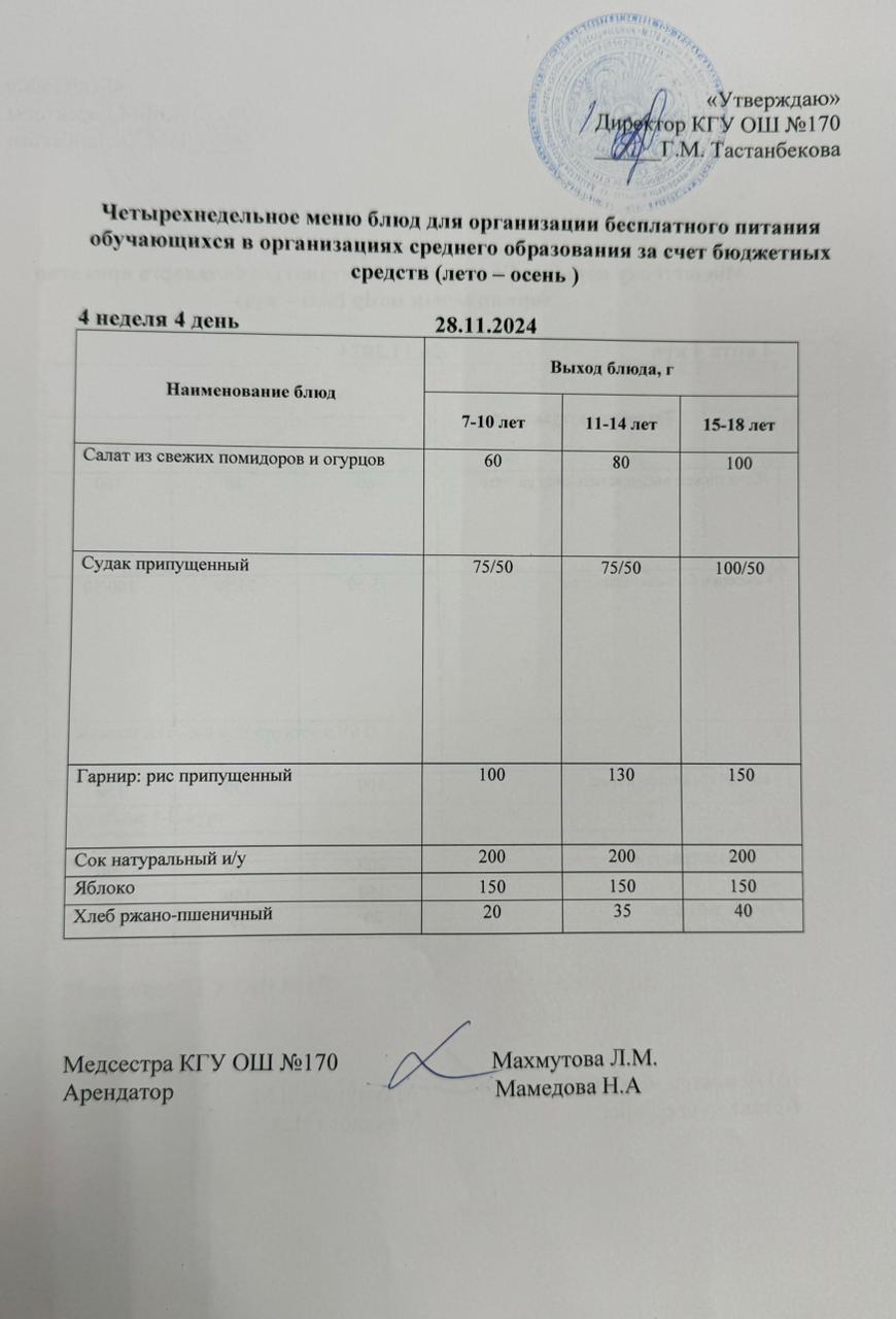 Жазға лагерь ас мәзірі/меню пришкольного лагеря на 28.05.2024ж.