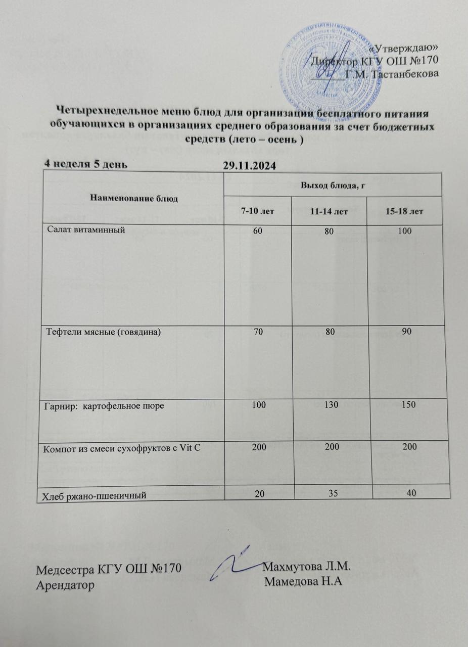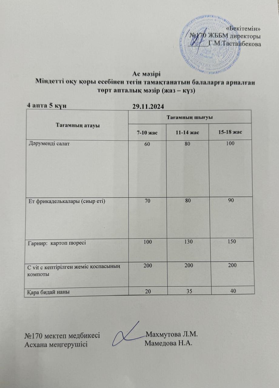 Жазға лагерь ас мәзірі/меню пришкольного лагеря на 28.05.2024ж.