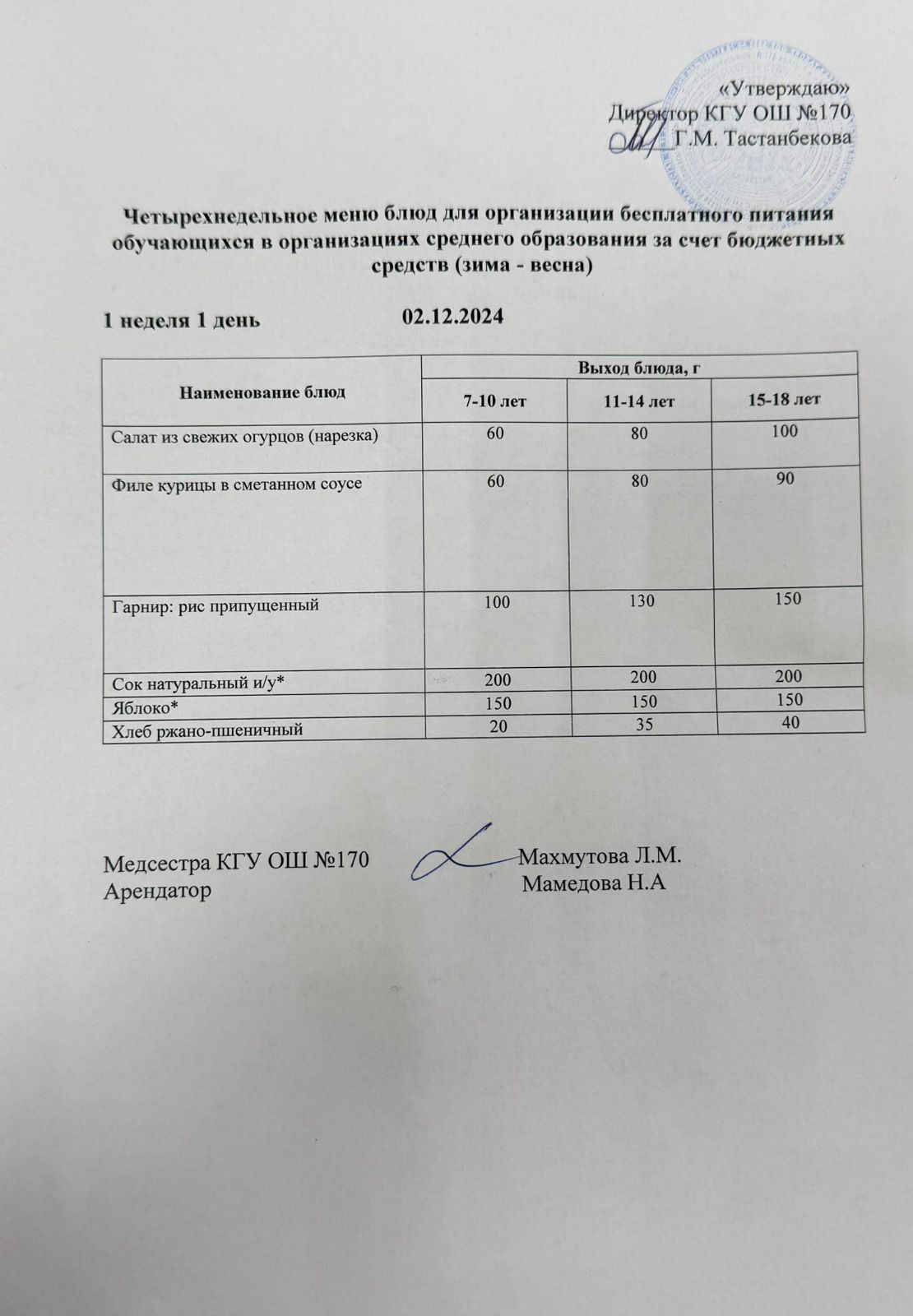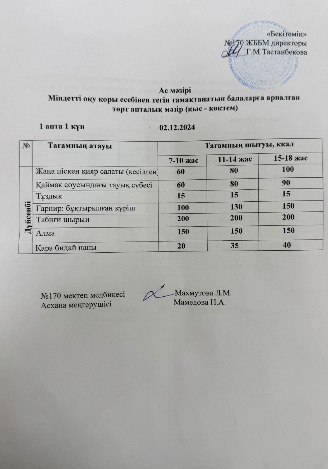 Жазға лагерь ас мәзірі/меню пришкольного лагеря на 28.05.2024ж.