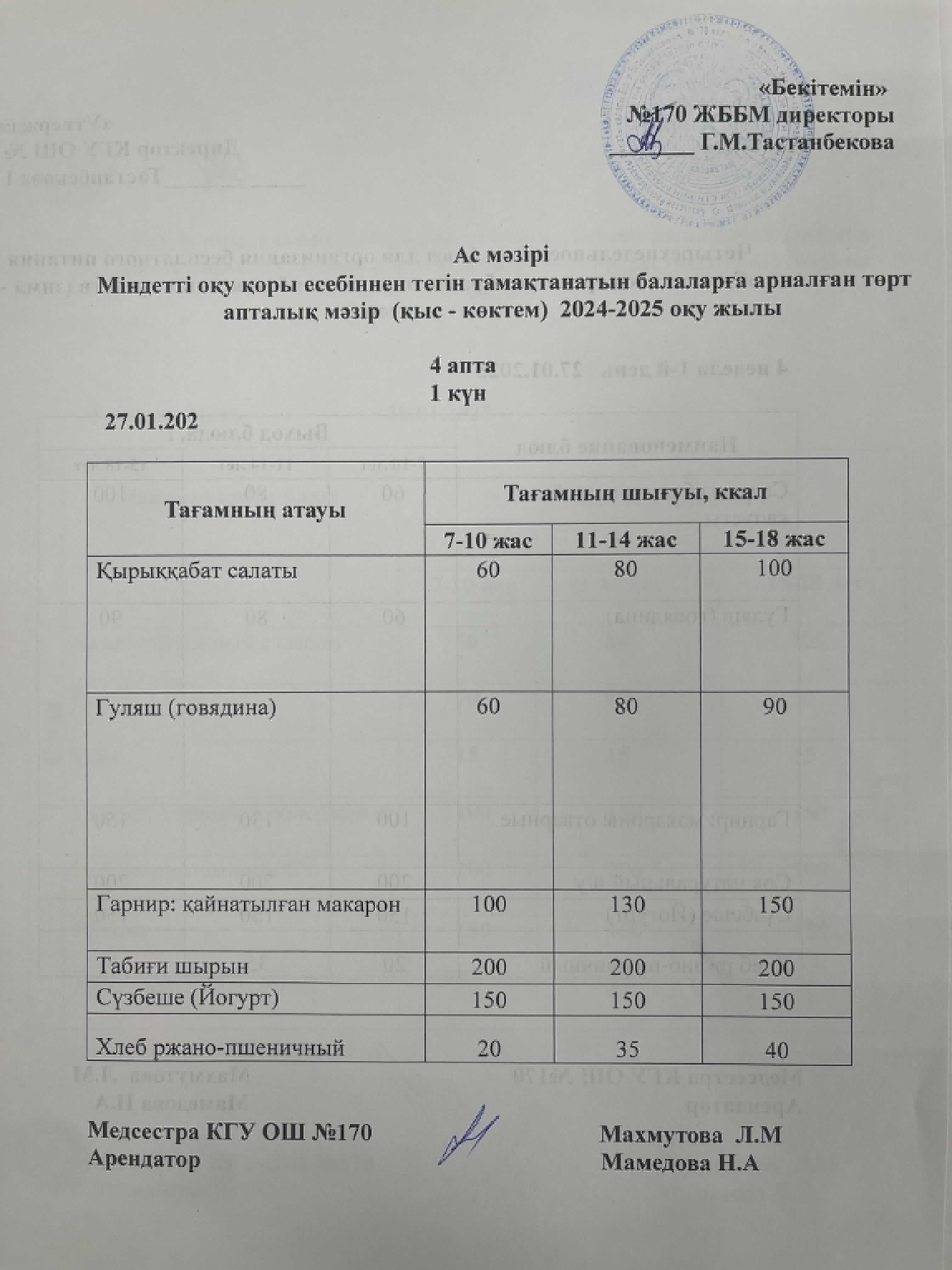 Ас мәзірі / Меню 27.01.2025
