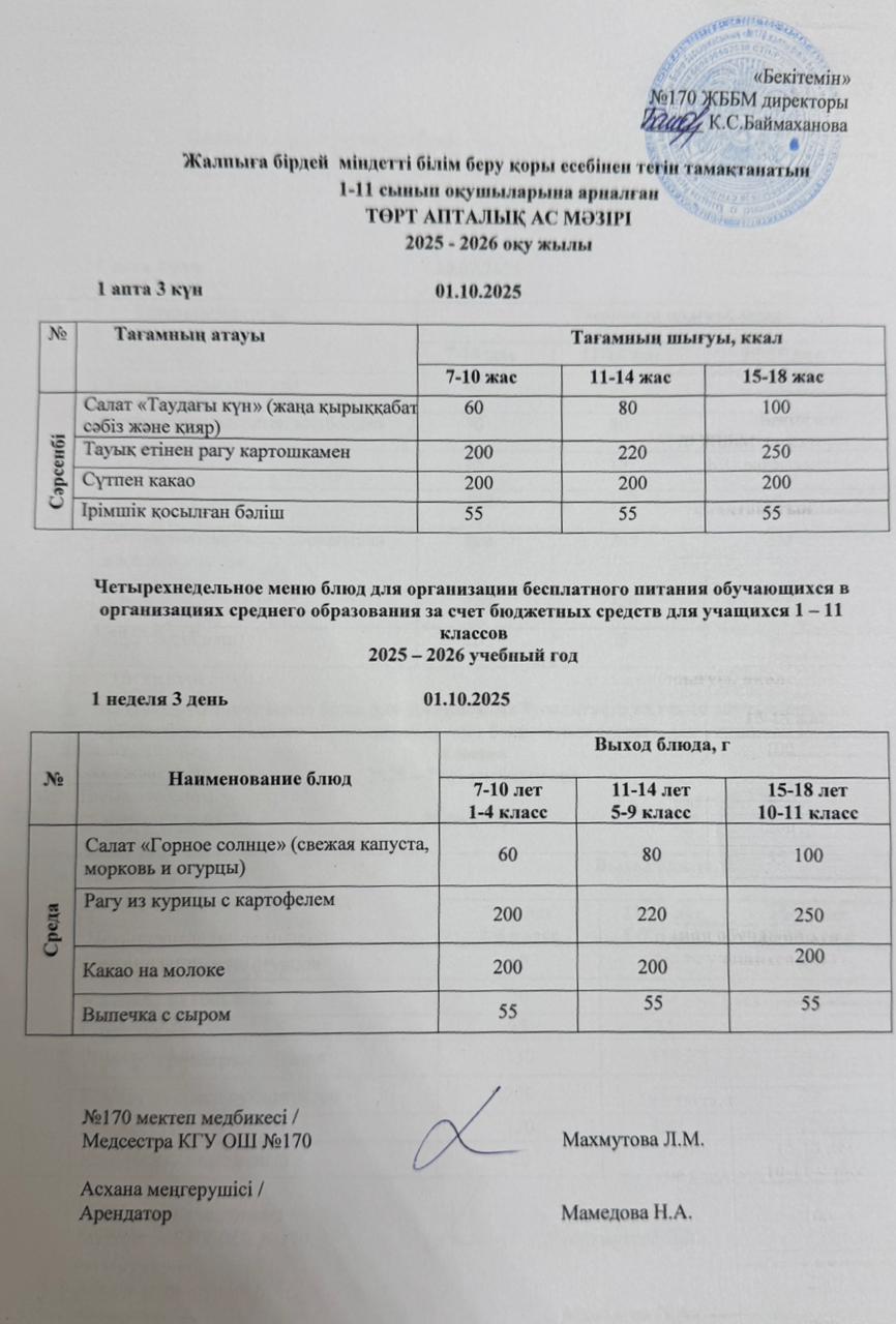 Ас мәзірі / Меню 01.10.2025