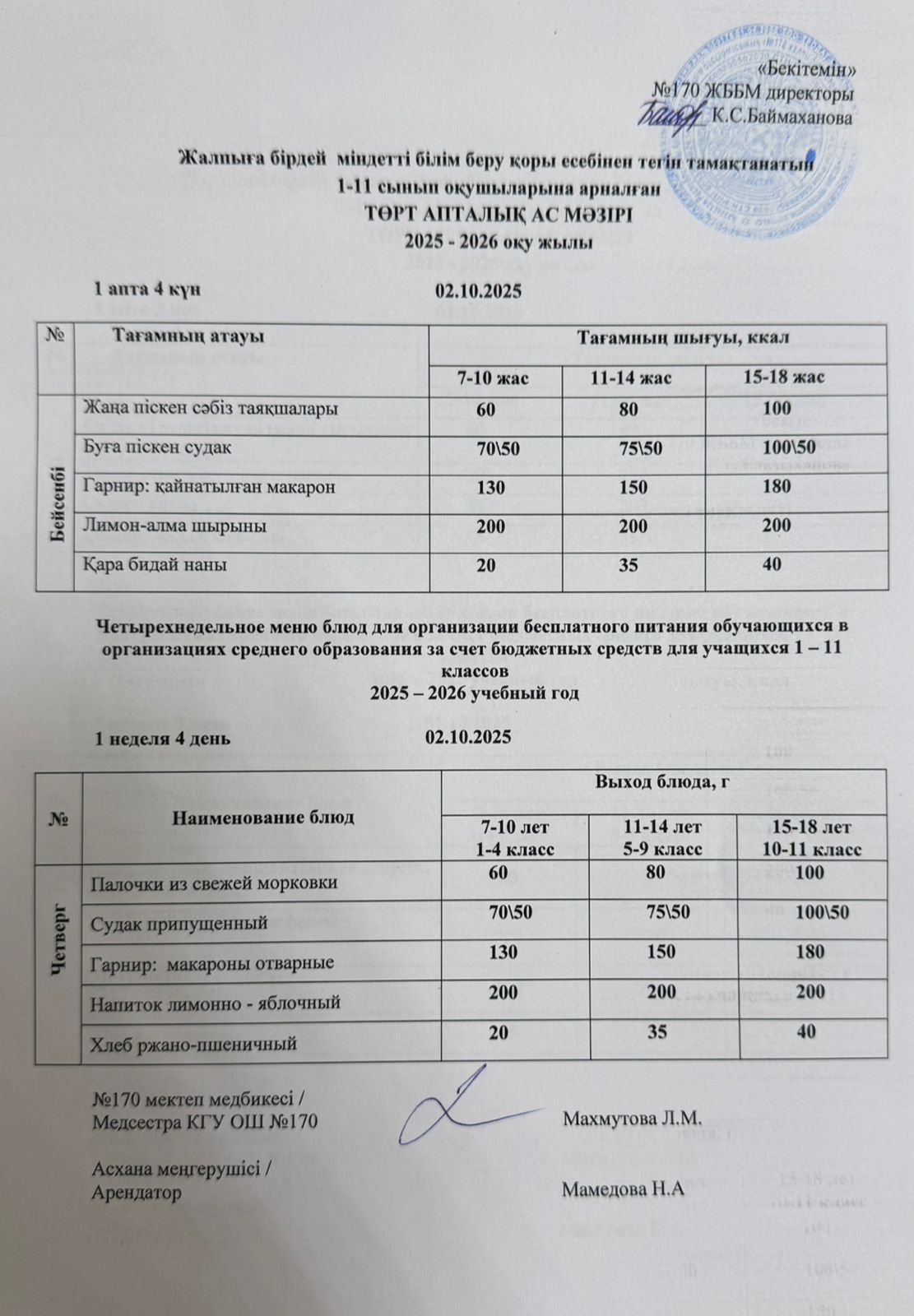 Ас мәзірі / Меню 02.10.2025