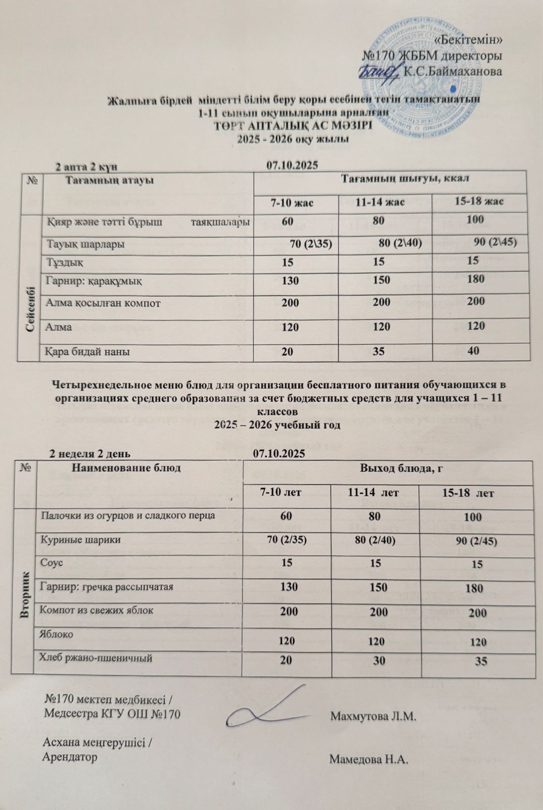 Қыркүйек айындағы ас мәзірі / меню на сентябрь 2025г
