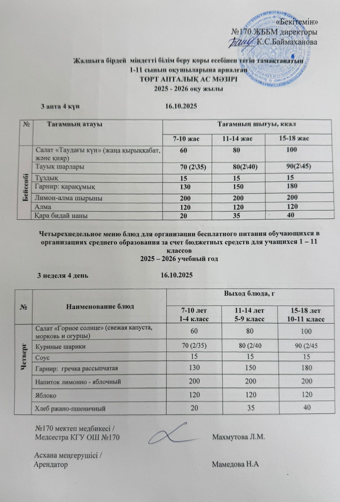Ас мәзірі / Меню 16.10.2025