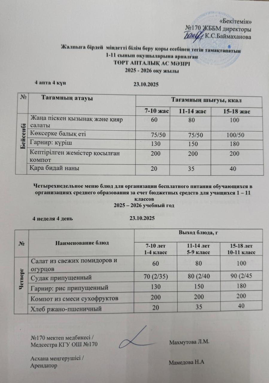 Қыркүйек айындағы ас мәзірі / меню на сентябрь 2025г