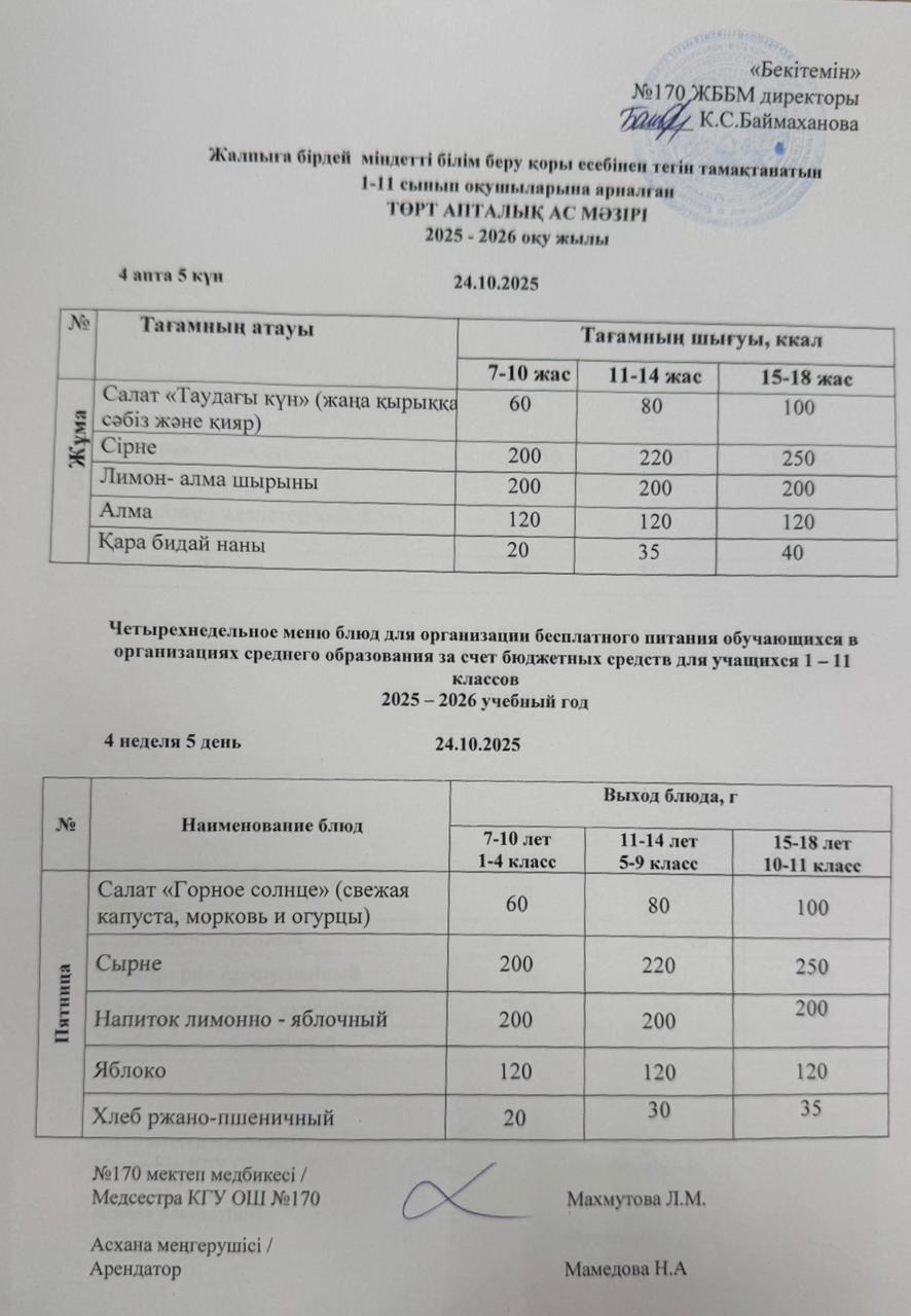 Қыркүйек айындағы ас мәзірі / меню на сентябрь 2025г
