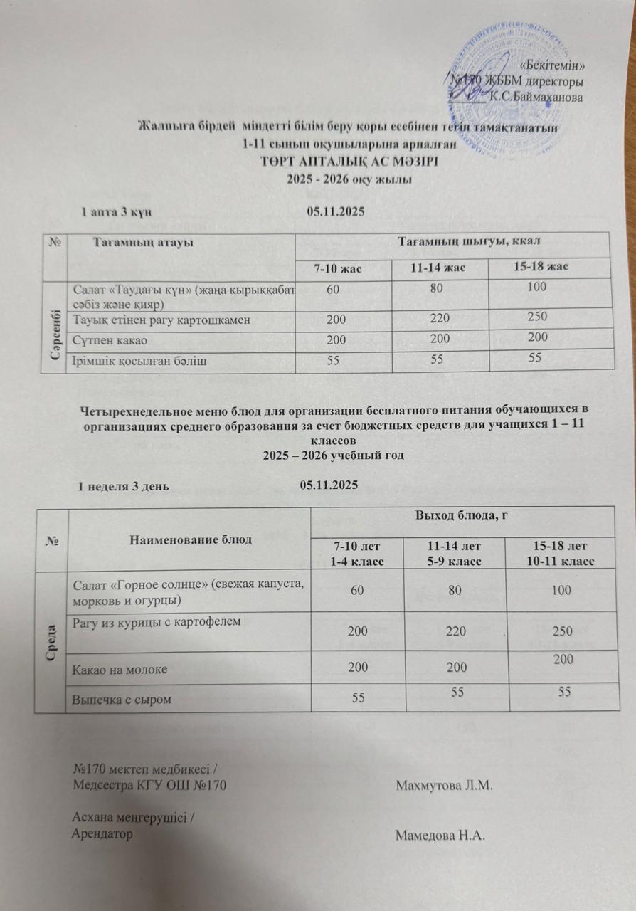 Ас мәзірі / Меню 05.11.2025