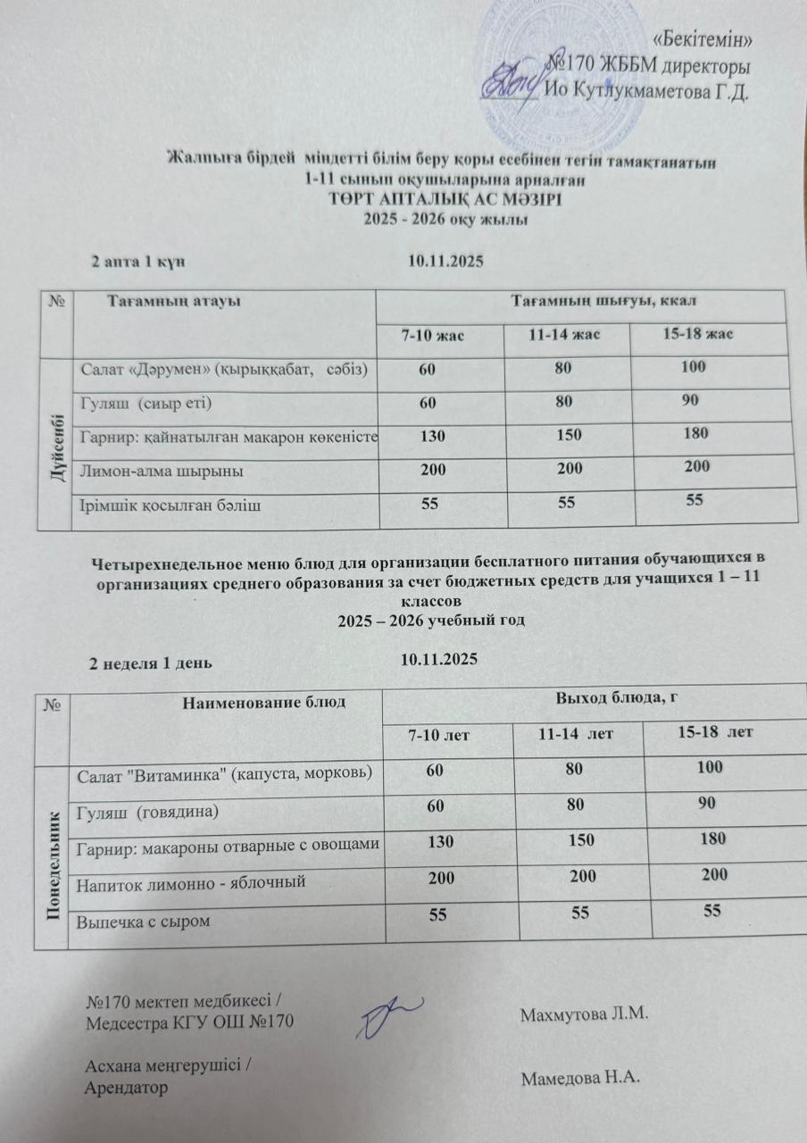 Қыркүйек айындағы ас мәзірі / меню на сентябрь 2025г