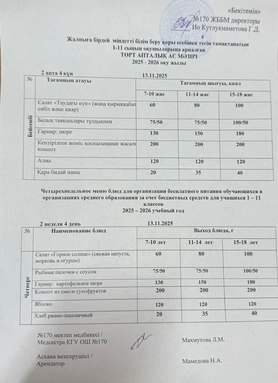 Қыркүйек айындағы ас мәзірі / меню на сентябрь 2025г