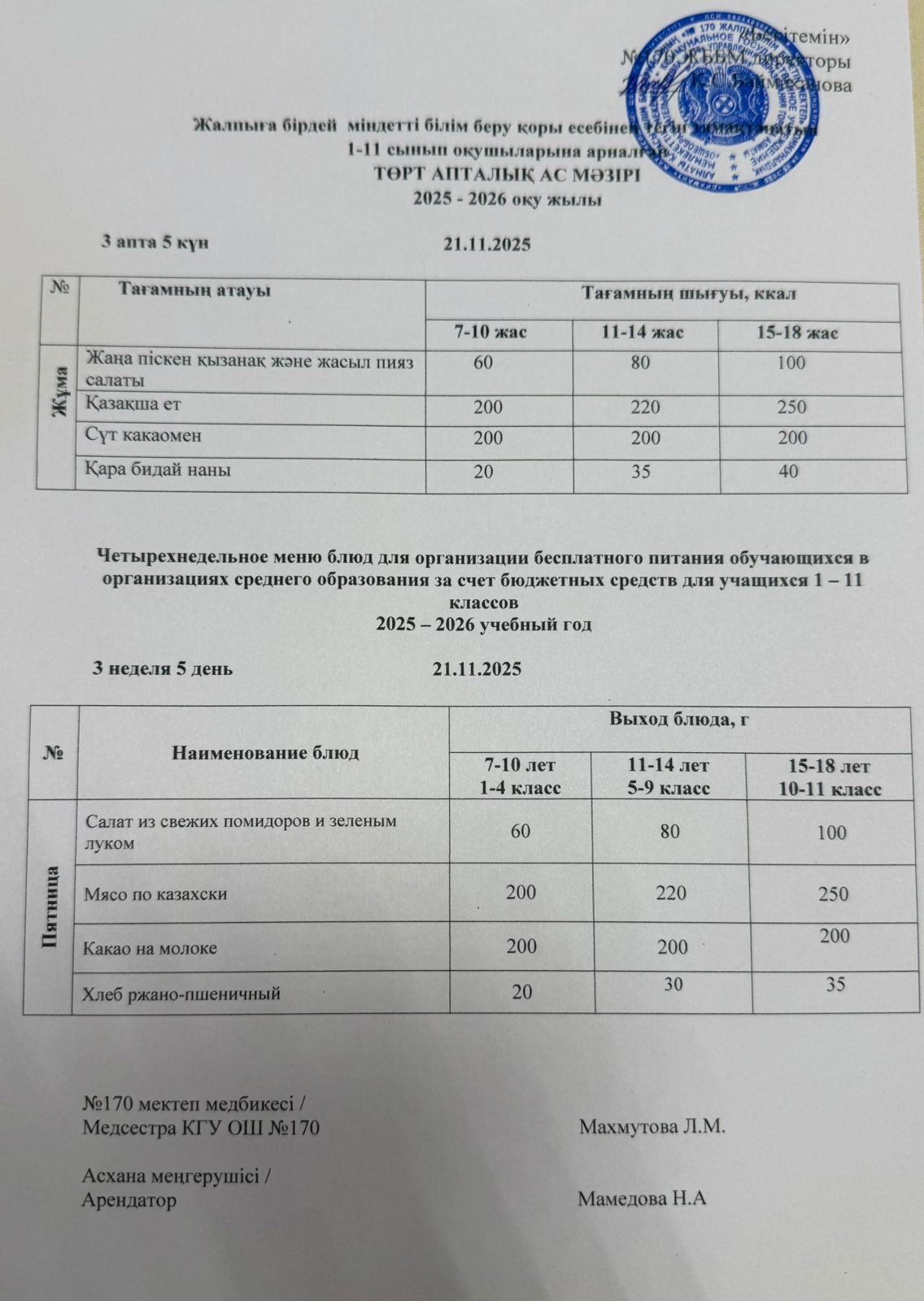 Қыркүйек айындағы ас мәзірі / меню на сентябрь 2025г