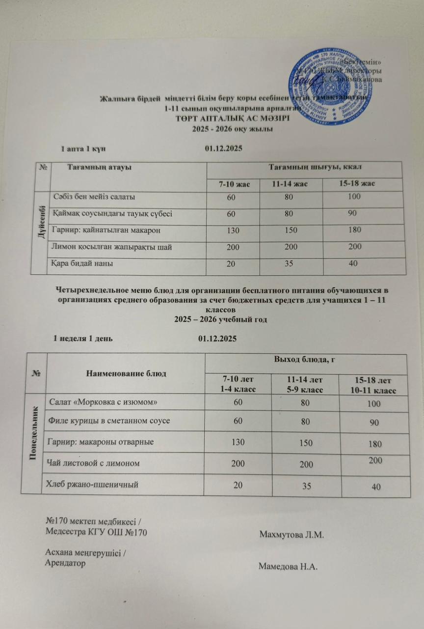Қыркүйек айындағы ас мәзірі / меню на сентябрь 2025г