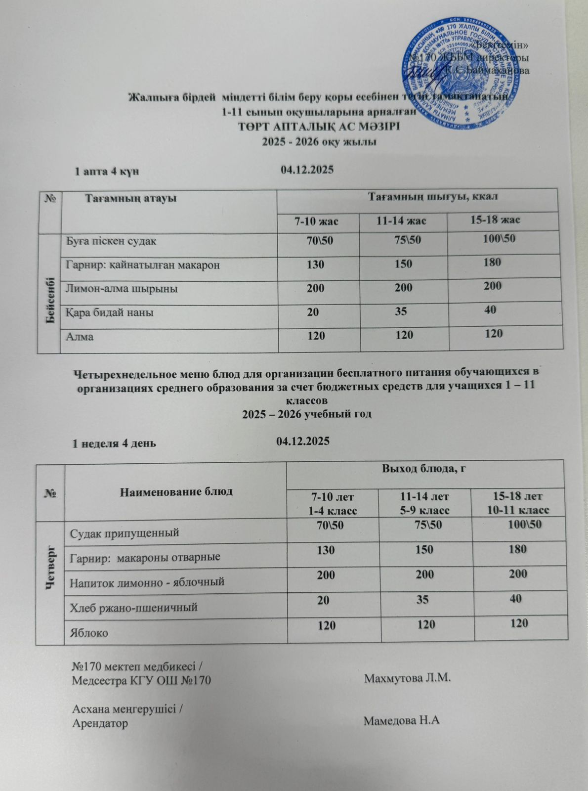 Қыркүйек айындағы ас мәзірі / меню на сентябрь 2025г