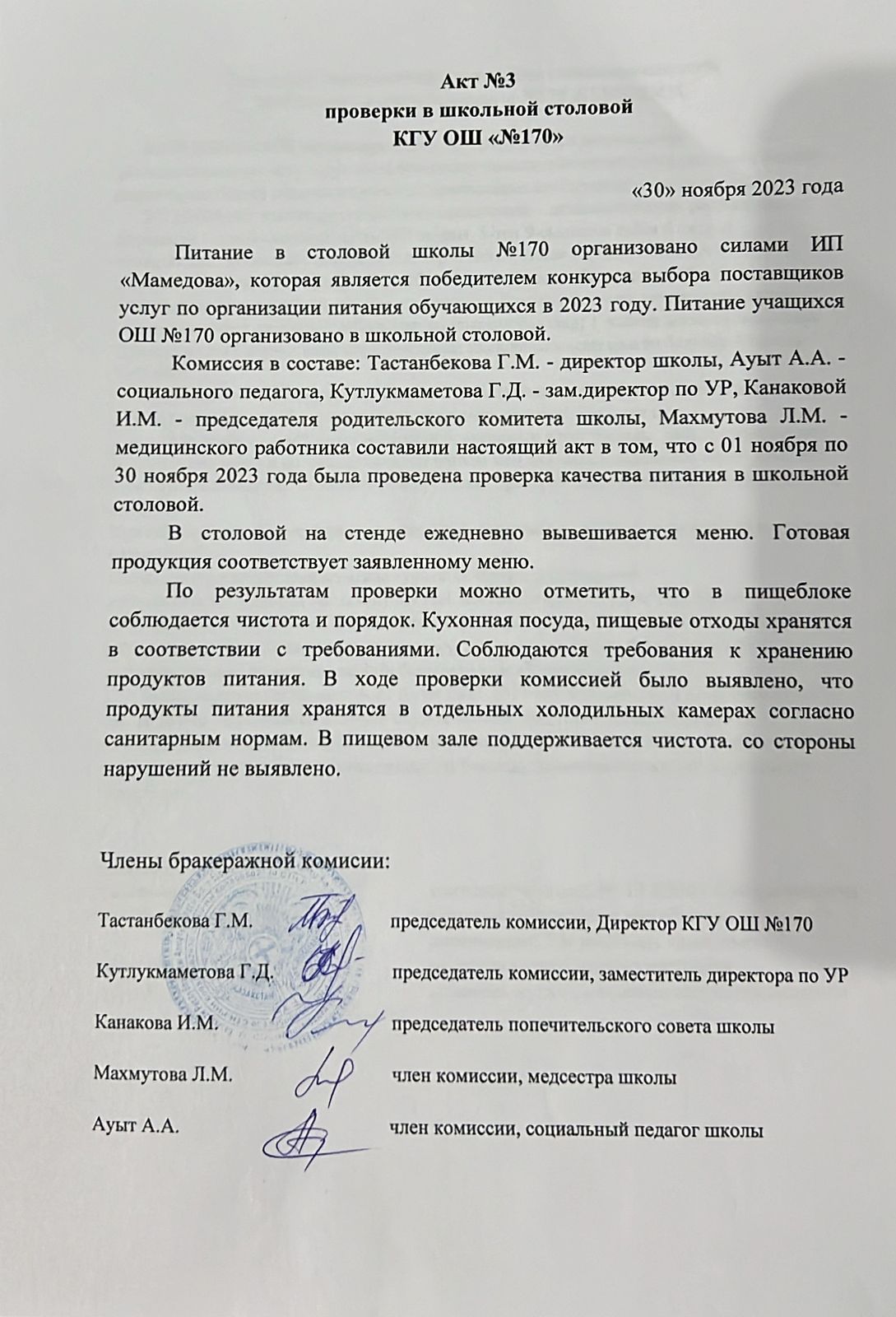 30 қараша 2023 0 1 2 3 4 5 Мектеп асханасын тексеру нәтижесінің №3 АКТі / АКТ №3 проверки в школьной столовой Осы беттің QR-коды:QR-код этой страницы:
